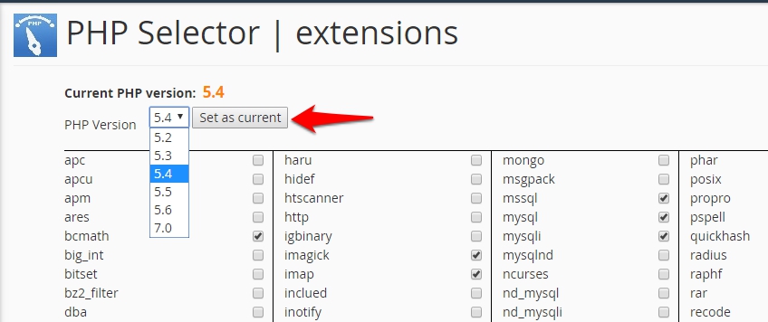 Select the required PHP version from the drop-down list and click on Set as current.