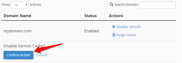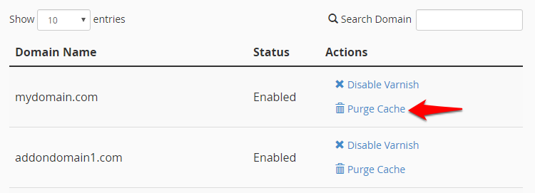 You can purge the cache by clicking on Purge Cache under Action next to any domain.