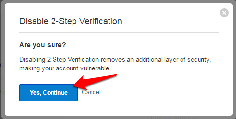 Click on Continue to confirm that you wish to disable 2-Step Verification.