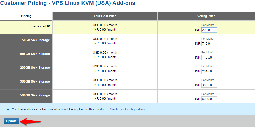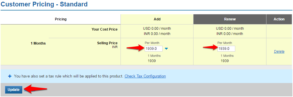 • Add the per month Selling Price and click on the Update button to save your changes.