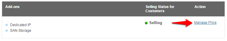 • You can set the pricing for Add-ons by clicking on the Manage Prices link under the Add-ons section.