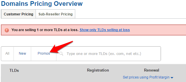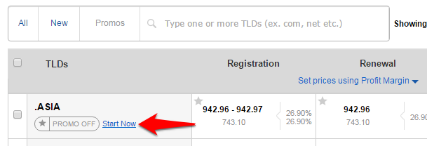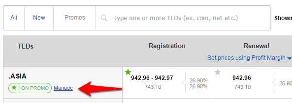 • A green star indicates that a Promo is activated for a TLD for Registration, Renewal and/or Transfer.
