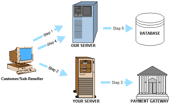 We simply create a collection of messages that you will need to charge this Customer / Sub-Reseller. This set of messages would contain things like Order Information, Amount etc. We then redirect the Customer to your Server with this set of messages.