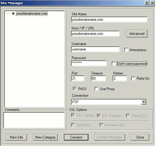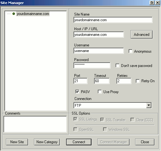 2. Provide your domain name under HOST / IP / URL. Type in your Username and Password and click Connect.