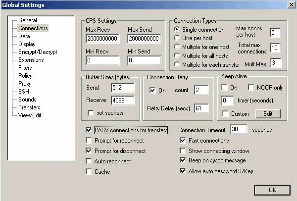 2. The Passive mode for data connection is set by default. Under the Global Settings dialog box, click Connections and uncheck PASV connections for transfers to enable the Active mode. Click OK to save the changes.